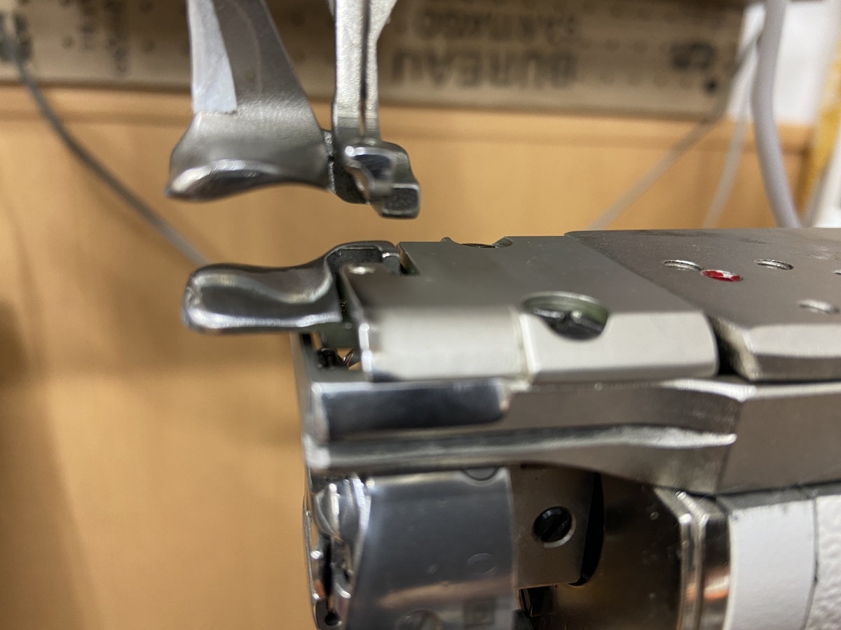 『革を縫うのによく使われる上下送りミシンや総合送りミシンは、2つの押えの動き(人が歩く時の脚の動きと似ていて、交互に革を上から押さえながら動いて送る)と、下側にある送り歯とが、うまく連動して革を送るため(総合送りミシンは、2つの押えと送り歯に加えて、針の動きも送りを助けている)、押えも2つ必要、と思っていれば良いと思います。』